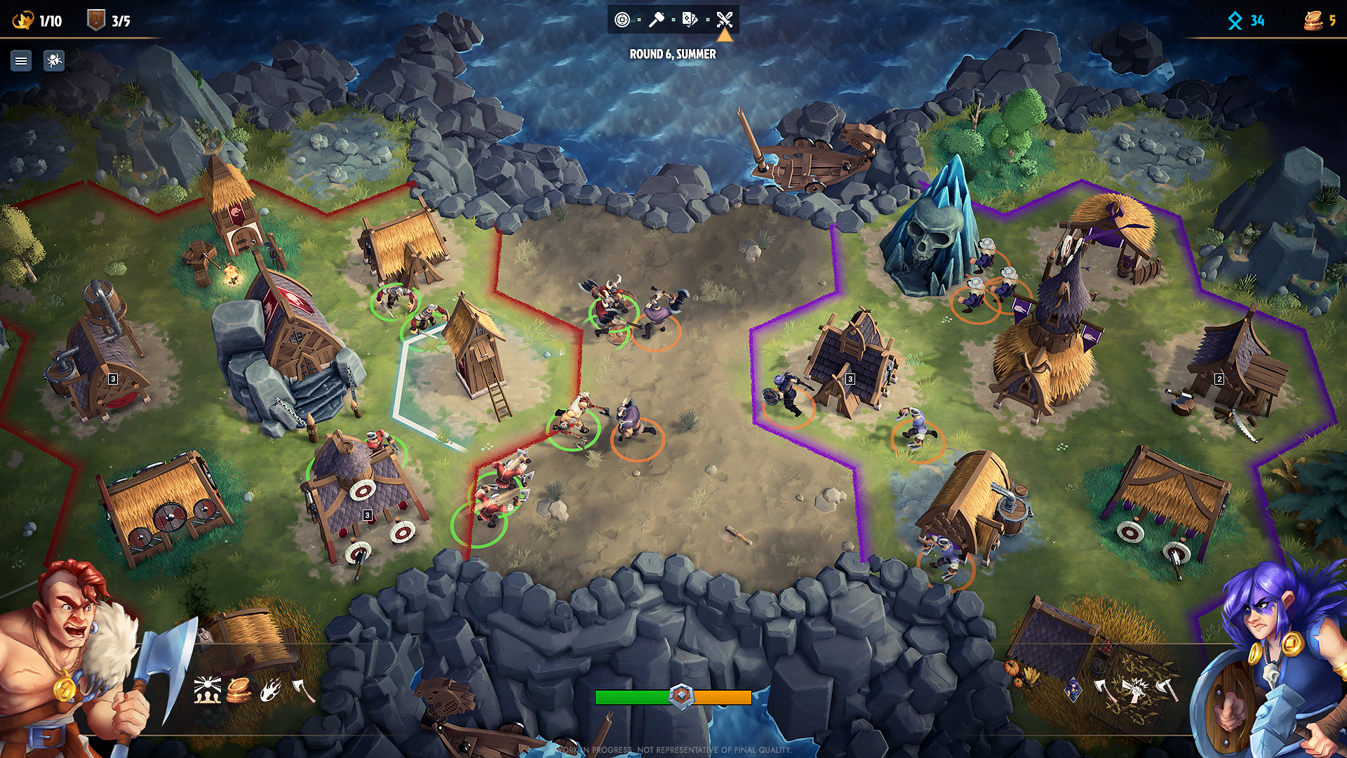 Your settlement’s layout is your greatest weapon. Construct economic buildings near resources to boost their production, raise military structures to recruit warriors, and build mythical sites to unleash powerful creatures on the battlefield! In Northgard Battlegrounds, every placement shapes your clan’s strength in combat. Plan wisely, your warriors will reap the benefits when the battle begins.